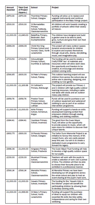 The Gwen Mayor Trust, a charity established in memory of Dunblane Primary School teacher Gwen Mayor, recently announced the nursery and primary school arts, sports, culture and community projects it is providing funding support for this year.